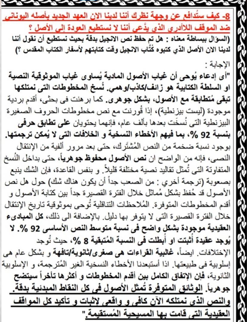 موريس روبنسون .. عالم نقد نصي ملحد .. ملحد .. ملحد .. ملحد .. ملحد مش مسيحي .. ملحد .. لا يجرأ على مخالفه اجماع كل العلماء ان الكتاب المقدس وصلنا كما كتب من الوف السنين بدون اي تغير وهذا ترجمة من مقابله معه : ![]() وهذا ما قاله بالانجليزي : 8. How would you defend your view that we now have the New Testament in the original Greek against the agnostic position that we cannot get back to the original? I dealt with this issue in my ETS 2005 paper, “The Integrity of the Early New Testament Text: A Collation-based Comparison”. In general, any claim that suggests absence of the physical autograph equals absence of textual reliability or biblical authority is bogus. The manuscript copies we possess remain substantially identical to the autographs. As demonstrated in my paper, the earliest extant (non-Byzantine) papyri compared against the text of Byzantine minuscule MSS copied a thousand years later share a verbal identity approximating 92% — including orthographic and non-translatable differences. With such a large percentage of common text, even over more than a millennium of transmission, it is clear that the autograph text substantially has been preserved, even among disparate copies representing quite different textual traditions. On the same principle, dispute hardly should arise as to whether the autograph text similarly was preserved during the much shorter period between autograph composition and the earliest extant MSS. Transmissional observations suggest an equally reliable transmissional history during the short period from which no evidence exists. In addition, all doctrinal essentials are clearly present within the ca. 92% average base text; no doctrine is established or negated within the remaining ca. 8% where differences occur. Also, most variants are quite minor and generally stylistic in nature. If the orthographic, non-translatable, and minor stylistic variants are excluded, the overall agreement among the earliest and latest MSS rises substantially. The existing documents accurately represent the autographs in all essential points. The text we now possess is sufficient and substantial for establishing and maintaining all doctrinal positions held within orthodox Christianity, skeptics and postmodernists such as Ehrman, Epp, Parker, or the media to the contrary. Interview with Maurice Robinson (Part 2 فريدريك كينيون واحد من اكبر علماء المخطوطات في العالم الذي قضي حياته كلها في علم المخطوطات : "تصبح الفترة الفاصلة بين تواريخ التكوين الأصلي وأول دليل موجود ، صغيرة جدًا بحيث تكون في الواقع ، لا تذكر ، والأساس الأخير لأي شك في أن الكتاب المقدس قد وصل إلينا بشكل كبير كما هو مكتوب الآن. إزالة. يمكن اعتبار كل من الأصالة والسلامة العامة لأسفار العهد الجديد ثابتة بشكل نهائي" "The interval then, between the dates of original composition and the earliest extant evidence, becomes so small as to be in fact, negligible, and the last foundation for any doubt that the Scriptures have come down to us substantially as they were written has now been removed. Both the authenticity and the general integrity of the books of the New Testament may be regarded as finally stablished." Sir Fredric Kenyon, The Bible and Archaeology (New York, NY: Harper and Row, 1940), pp. 288, 289 جورجيو باسكالي الناقد النصي وعالم فقه اللغة الكلاسيكية يقول عن العهد الجديد : "لا يوجد نص يوناني آخر يتم تناقله بهذا الثراء والمصداقية." “ No other Greek text is handed down so richly and credibly ”. Giorgio Pasquali, Storia della tradizione e critica del testo, 2nd ed. (Florence: Le Monnier, 1952), 8. I am grateful to Peter J. Gurry for the citation. ايمي اندرسون وويندي ويدرعن العهد القديم والجديد : "يمكننا أن نثق في أن الكتاب المقدس الذي نستخدمه يعكس درجة غير عادية من الدقة والأمانة" “we can have confidence that the Bible we use reflects an extraordinary degree of accuracy and integrity” (Amy Anderson and Wendy Widder, Textual Criticism and the Bible. Revised Edition p.184). البروفيسور كورت ألاند أحد أكثر نقاد نصوص العهد الجديد شهرة ومحرر Nestle / Aland Novum Testamentum Graece : "إن نقل نص العهد الجديد رائع ، أفضل من نقل أي كتابات أخرى في العصور القديمة، إن فرصة إيجاد مخطوطات تغير نصها بشكل أساسي تساوي صفرًا" "The transmission of the New Testament text is outstanding, better than that of any other writings of antiquity. The chance of finding manuscripts that essentially change its text is equal to zero." Kurt Aland, Das Neue Testament zuverlässig überliefert. Die Geschichte des neutestamentlichen Textes und die Ergebnisse der modernen Textforschung, Reihe: Wissenswertes zur Bibel, Stuttgart 1986, S. 28, free translation . عالم النقدي النصي Paul D. Wegner : " ساعد الفحص الدقيق لهذه المخطوطات في تعزيز تأكيدنا على أن النصوص النقدية اليونانية والعبرية الحديثة قريبة جدًا من الاتوجرافات الأصلية ، على الرغم من عدم وجود هذه الاتوجرافات." Careful examination of these manuscripts has served to strengthen our assurance that modern Greek and Hebrew critical texts are very close to the original autographs, even though we do not have 