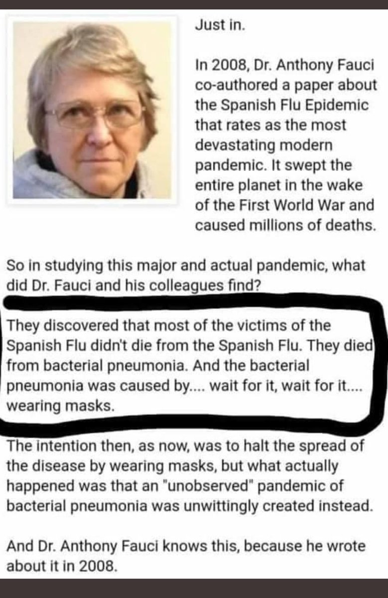 واشنطن تايمز https://www.washingtontimes.com/news/202...n-history/ https://www.washingtontimes.com/news/202...etrated-b/ ![]() صورة اكبر https://pbs.twimg.com/media/EZf8husVcAASBrk?format=jpg (يجب أن ندرك جميعًا الآن أن الكمامة لم تثبت أبدًا أنها تمنع انتقال الفيروس أو تحمي منه. وهذا هو بالضبط سبب عدم التوصية باستخدامها مطلقًا أثناء تفشي الانفلونزا الموسمية أو الأوبئة السابقة.) Jim Meehan - طبيب جراح https://www.sott.net/article/438827-...eons-wear-them الدكتور فاوتشي نفسه كتب التقرير في 2008 مع زملاء يقول ان اغلب من مات في جائحة 1918 ماتوا بسب بكتريا سببت التهاب الرئة pneumonia وجائت البكتريا من لبس الماسك. منظمة الكحة العالمية فرضت الماسك علينا وهي تعرف. ففيها خبراء كبار مثل فاوتشي. https://pbs.twimg.com/media/ElLx3x7XgAAHtcv?format=jpg طبيب فاشنستا أمريكي ( دكتور مايك) مروج للتطعيمات و الكمامات يكسر قواعد التباعد الاجتماعي و الكمام و يحتفل بعيد ميلاده وسط سخط متابعيه في وسائل التواصل الاجتماعي ..!! https://www.dailymail.co.uk/news/art...-maskless.html |